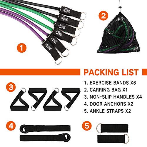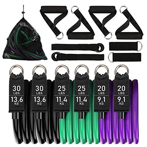 💪【16 IN 1 RESISTANCE BANDS SET】 – 6 Resistance Bands: 2 x Purple (20 lbs), 2 x Green (25 lbs), 2 x Black (30 lbs). Accessories: 4 x Cushioned Foam Handles, 2 x TPE Foam Door Anchors, 2 x Ankle Straps, 1 x Carrying Bag. Exercise tubes with handles and heavier tension allow you to try more different training ways. We especially increase the handles from 2 to 4, work out with your friends and will help you get a better workout experience.
