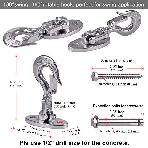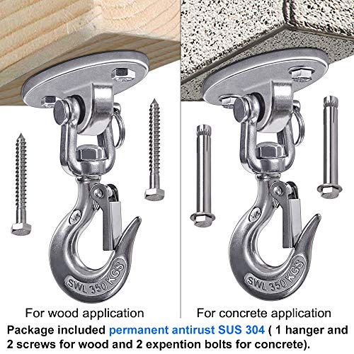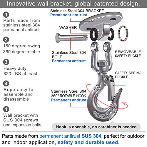 INNOVATIVE DESIGN: Design with a strong heavy duty hook, the hook can rotate with 360 and swing back and forth with 180. And to ensure the safety, we have assembled an O’ ring with material SUS304 stainless steel to avoid the shaft slide out, also the buckle of the hook is strong enough to ensure the safety use.