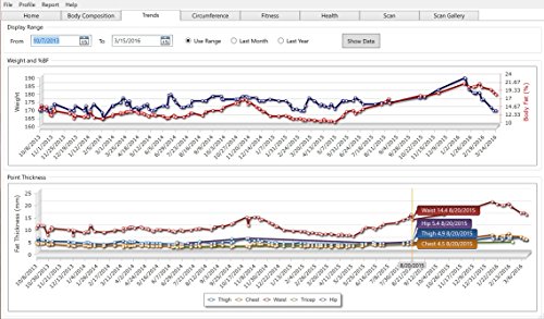 Integrated software tracks & graphs % Body Fat, weight, fat thickness. Calculate BMR and BMR with Activity.