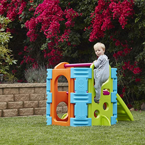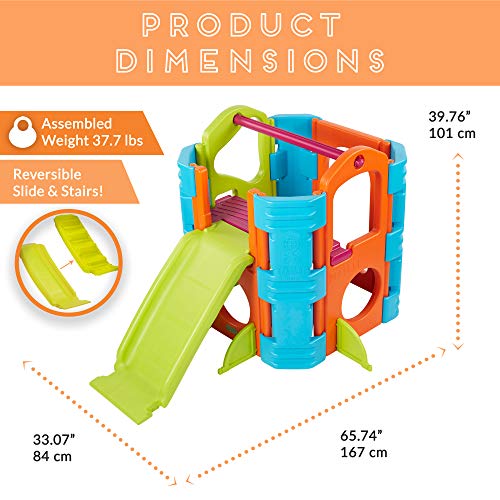 The ECR4Kids Activity Park is suited for children 3 years old and up to 66 pounds and is a whole playground of options in one vibrantly colored play structure. Easy to assemble and adapt, the slide can quickly be converted to stairs for young climbers. Pieces simply click into place for playtime. Clever cut-out shapes create the perfect place to grab a hold and climb or peek out while hiding inside this naturally playful design. Weather and fade-resistant all-plastic design makes this the ideal outdoor toy for kids. Just as easily, the lightweight design can be transported indoors. No tools required for easy adult assembly and disassembly for easy storage. Simply wipe clean with a soft towel and mild soap and water. This outdoor and indoor kids play structure measures 65.74” L x 33.1” W x 39.75” H with a 66 lbs weight capacity.