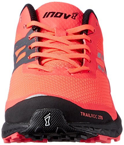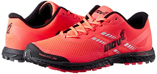 Run fast and smoothly over rocky and hard-packed trails with the superior grip and underfoot protection of the inov-8® Trailroc 270 running shoe. Predecessor: None. Support Type: Neutral to underpronation (supination).Cushioning: Lightweight, flexible response. Surface: Trail. Differential: 4 mm.Designed for running swiftly over a variety of terrains. Breathable, lightweight mesh and synthetic upper materials. Seamless construction allows for an irritation-free foot environment. Met-Cradle+ wraps around the midfoot, from the laces to the midsole, ensuring a secure, locked down fit for the foot and extra support for the arch of the foot. Lace-up closure. Protective rubber toe cap. Padded tongue and collar. Comfortable fabric lining offers a great in-shoe feel. Removable 6 mm insole.POWERFLOW+ midsole supplies 10% greater shock absorption and 25% better energy return compared to standard midsoles. Fifth-gen META-SHANK rock plate protects the foot from sharp rocks and debris.External Toe Cap protects the toes from rocks and other debris that may be accidentally kicked or tripped over when running on the trail. Dynamic Fascia Band rock plate delivers the ultimate in underfoot protection, so a runner feels no pain from sharp rocks. The band also flexes with the foot’s natural running gait, delivering a kick of energy with every stride.Tri-C Sticky rubber outsole is designed with three sticky rubber compounds that increases grip and durability. The hardest, most durable rubber is on the heel, with a soft rubber up the centre for increased traction and a medium rubber on the edges for grip and security with every foot strike. Imported. Measurements: Weight: 9 oz Product measurements were taken using size UK 6.5 (US Women’s 9), width M. Please note that measurements may vary by size.Weight of footwear is based on a single item, not a pair.