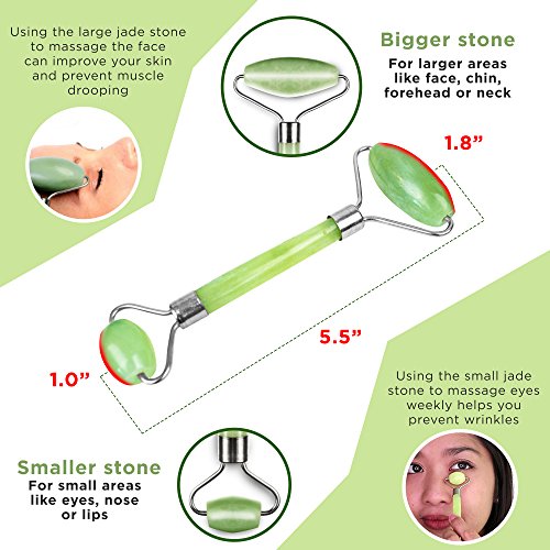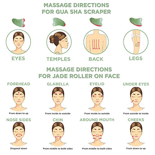 ✅ HOW TO USE JADE ROLLER – Our Facial Roller has a double ended roller to accommodate different facial areas: the smaller roller for eye area, while larger one for neck ,face. Roll the product in an up and out motion from the neck toward the forehead. HOW TO USE GUA SHA SCRAPER – Keep it at 15 degree angle when moving from the center of the face towards to hairline, then down the neck towards collar bone. For extra healing, relaxation & inflammation reduction, place stone in refrigerator.