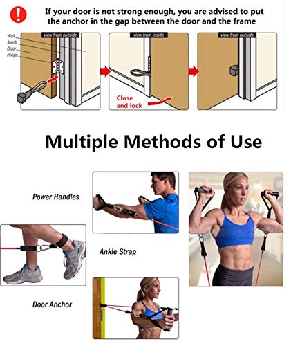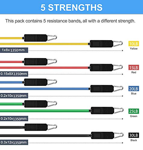 ✓ 12PCS SET FOR MAXIMUM PERFORMANCE -5 Resistance Bands: 1 x Yellow (10 lbs.), 1 x Blue (20 lbs.), 1x Green (25 lbs.), 1x Red (15 lbs.),1x Black (30 lbs.) .1 x Door Anchor, 2 x Ankle Straps, 1x Carrying Bag ,2 x Cushioned Foam Handles,1xWorkout Guide.