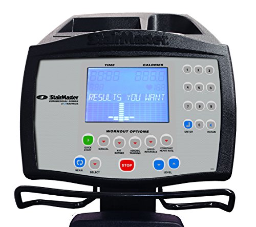 You are looking at the StairMaster Stepmill 7000PT. You can achieve the same cardiovascular workout as you would on a treadmill plus get a superior lower-body muscular workout. The StepMill 7000PT works the heart, lungs, and muscles without jarring your joints. The StepMill 7000PT is a one-of-a-kind ultimate stair climber … Programs (6): Quick start, Manual, Fat Burner, Aerobic Training, Speed Intervals, and Constant HR … Displays: calories, time, distance, floors climbed, step rate, METs and watts … 20 Resistance Levels … Heart Rate Monitoring: Telemetry … Convenient Quick Start remembers your workout setting … Step Range: 8″ Fixed … Step rate: 24 to 162 steps per minute … Console Accessories: Reading rack, water bottle holder & accessory tray … Weight: 409 lbs … Max User Weight: 300 lbs … Dimensions: 50″L x 29″W x 78″H … Voltage: 110V (works on any standard outlet)